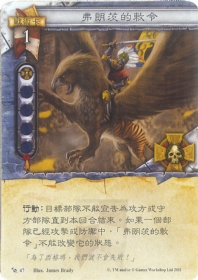 功能说明行动:目标部队不能宣告为攻方或守方部队直到本回合结束。如果一个部队已经攻方或防御中,「弗朗茨的敕令」不能改变它的状态。