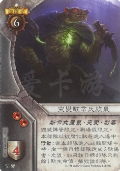 :当本部队进入或离开场中时,向一个目标部队造成2点伤害。之后,如果该目标部队只剩1点生命值,摧毁该部队。