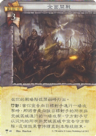 :当你宣告向目标对手进行一场攻击时,那将会是向该目标牌手的所有非焚城区域进行一场攻击。守方对手可以从他的所有非焚城区域中宣告守方部队。这个效果会持续直到本阶段结束。