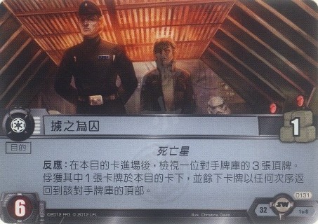 :在本目的卡进场后,检视一位对手牌库的3张顶牌。俘获其中1张卡牌于本目的卡下,并余下卡牌以任何次序返回到该对手牌库的顶部。