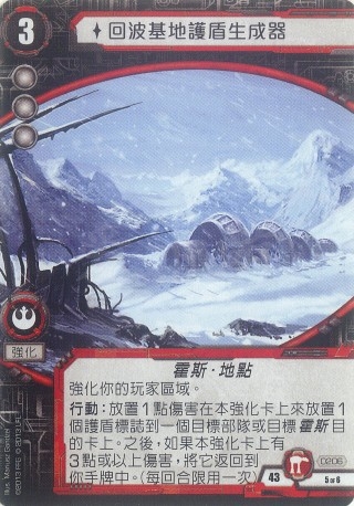 行动:放置1点伤害在本强化卡上来放置1个护盾标志到一个目标部队或目标霍斯目的卡上。之后,如果本强化卡上有3点或以上伤害,将它返回到你手牌中。(每回合限用一次)