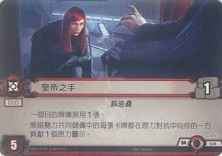 黑暗势力共同储备中的每张卡牌都在原力对抗中向你的一方贡献1个原力图示。