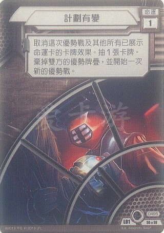 取消这次优势战及其他所有已展示命运卡的卡牌效果。抽1张卡牌。弃掉双方的优势牌叠,并开始一次新的优势战。