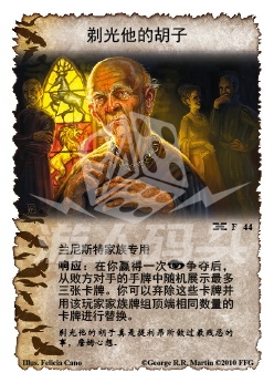 响应:在你赢得一次阴谋争夺争夺后,从败方对手的手牌中随机展示最多三张卡牌。你可以弃除这些卡牌并用该玩家家族牌组顶端相同数量的卡牌进行替换。
