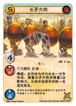 响应:在你作为守方失去一次争夺后,横置长矛方阵并横置3点影响力,从场中选择并弃除一名进攻角色。