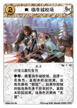 :横置临冬城校场,选择一名角色。直到本阶段结束,该角色拥有“群战”。如果你控制的独有角色多于所有对手,直到本阶段结束,该角色还拥有“名望”。