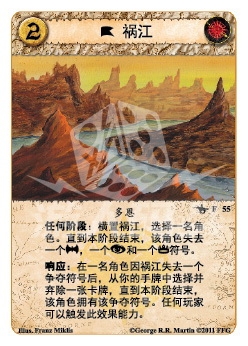 :在一名角色因祸江失去一个争夺符号后,从你的手牌中选择并弃除一张卡牌,直到本阶段结束,该角色拥有该争夺符号。任何玩家可以触发此效果能力。