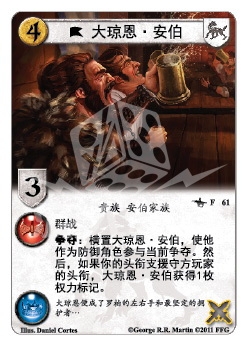 争夺:横置大琼恩·安伯,使他作为防御角色参与当前争夺。然后,如果你的头衔支援守方玩家的头衔,大琼恩·安伯获得1枚权力标记。