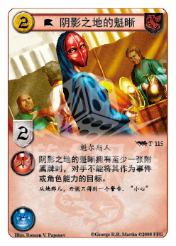 功能说明 阴影之地的魁晰拥有至少一张附属牌时,对手不能将其作为事件或角色能力的目标。