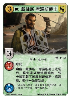 响应:戴佛斯·席渥斯爵士进场后,将你家族牌组顶端的一张卡牌面朝下附属到戴佛斯·席渥斯,视为一张复制品。