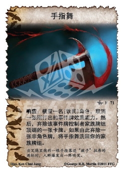 :横置一名[铁民]角色,取消一张刚打出的事件牌效果能力。然后,弃除该事件牌控制者家族牌组顶端的一张卡牌。如果由此弃除一张非角色牌,将手指舞洗回你的家族牌组。