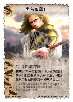 响应:在一位玩家为他/她的家族获得1枚或更多权力标记后,将这些权力标记转移到一名兰尼斯特家族角色上。