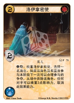 :横置洛伊拿密使,选择一名角色。如果该角色没有宣告参与本阶段下一次可以合理参与的争夺,从场中弃除该角色。任何对手可以横置2点影响力,取消此效果能力。