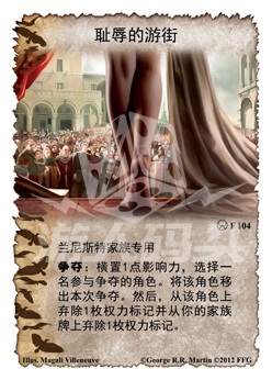 :横置1点影响力,选择一名参与争夺的角色。将该角色移出本次争夺。然后,从该角色上弃除1枚权力标记并从你的家族牌上弃除1枚权力标记。