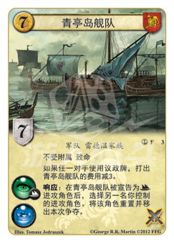 如果任一对手使用议政牌,打出青亭岛舰队的费用减3。