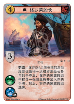 :在你以4点或更高的总强度差值赢得一次格罗莱船长参与的争夺后,在你的家族牌组中搜寻一张附属牌并加入你的手牌。然后,将你的家族牌组洗牌。