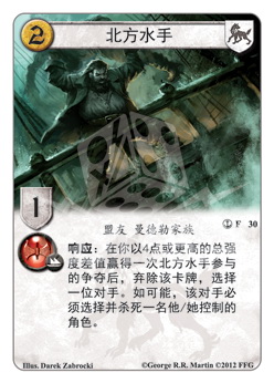 响应:在你以4点或更高的总强度差值赢得一次北方水手参与的争夺后,弃除该卡牌,选择一位对手。如可能,该对手必须选择并杀死一名他/她控制的角色。