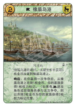 响应:在你赢得一次争夺后,从橡盾岛港弃除1枚金币,你的家族获得1枚权力标记。(如果有海战进攻角色或防御角色参与该次争夺,则以弃除2枚金币为你的家族获得2枚权力标记代替。)