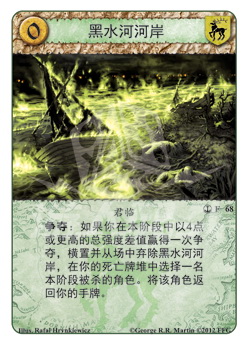 :如果你在本阶段中以4点或更高的总强度差值赢得一次争夺,横置并从场中弃除黑水河河岸,在你的死亡牌堆中选择一名本阶段被杀的角色。将该角色返回你的手牌。