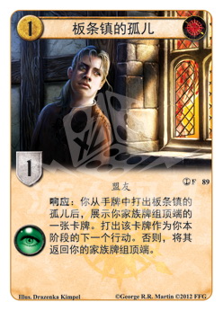 :你从手牌中打出板条镇的孤儿后,展示你家族牌组顶端的一张卡牌,打出该卡牌作为你本阶段的下一个行动。否则,将其返回你的家族牌组顶端。