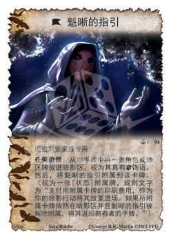 饰语。然后,将魁晰的指引附属到该卡牌。(视为一张[状态]附属牌,规则文字为“支付所附属卡牌的印刷费用,作为你的暗影行动将其放置进场。如果所附属卡牌依然在暗影区并且魁晰的指引被解除附属,将其返回拥有者的手牌。”)