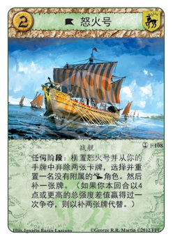 任何阶段:横置怒火号并从你的手牌中弃除两张卡牌,选择并重置一名没有附属的拜拉席恩家族角色。然后补一张牌。(如果你本回合以4点或更高的总强度差值赢得过一次争夺,则以补两张牌代替。)
