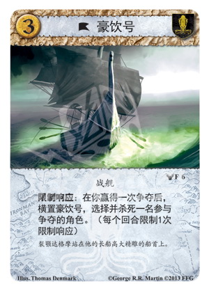 :在你赢得一次争夺后,横置豪饮号,选择并杀死一名参与争夺的角色。(每个回合限制1次限制响应)