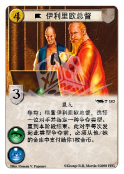 :横置伊利里欧总督,选择一位对手并指定一种争夺类型。直到本阶段结束,此对手每次发起此类型争夺前,必须从他/她的金库中支付给你1枚金币。