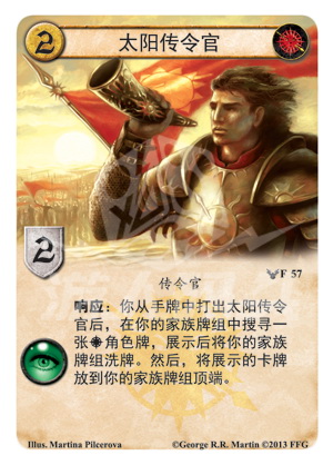 响应:你从手牌中打出太阳传令官后,在你的家族牌组中搜寻一张马泰尔家族角色牌,展示后将你的家族牌组洗牌。然后,将展示的卡牌放到你的家族牌组顶端。