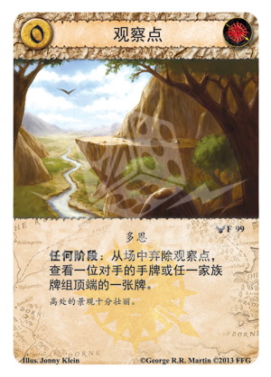 任何阶段:从场中弃除观察点,查看一位对手的手牌或任一家族牌组顶端的一张牌。