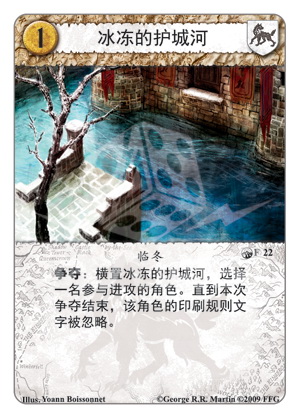 功能说明 争夺:横置冰冻的护城河,选择一名参与进攻的角色,直到本次争夺结束,该角色的印刷规则文本被忽略。