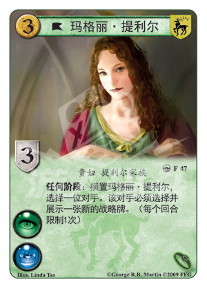 :横置玛格丽·提利尔,选择一位对手,该对手必须选择并展示一张新的战略牌。(每个回合限制1次)