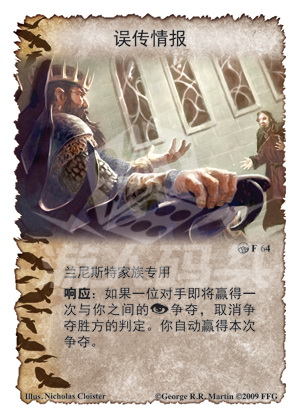 响应:如果一位对手即将赢得一次与你之间的阴谋争夺争夺,取消争夺胜方的判定,你自动赢得本次争夺。