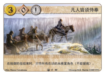 功能说明 在统御阶段结束时,弃除所有在场的未横置角色(不能援救)。