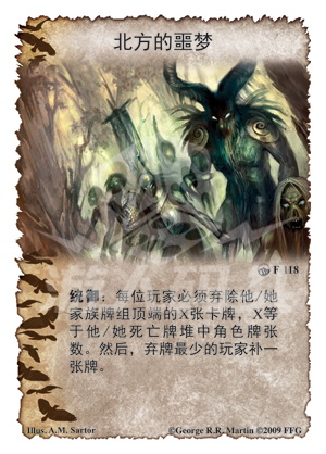 功能说明 统御:每位玩家必须弃除他/她家族牌组顶端的X张卡牌,X等于他/她死亡牌堆中角色牌张数。然后,弃牌最少的玩家补一张牌。