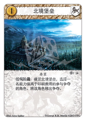 :横置北境堡垒,选择一名能力值高于印刷费用的参与争夺的角色。将该角色移出争夺。