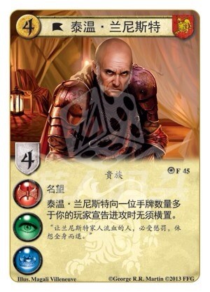 泰温·兰尼斯特向一位手牌数量多于你的玩家宣告进攻时无须横置。