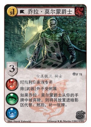 如果乔拉·莫尔蒙爵士从你的手牌中被弃除,则将其放置进暗影区代替。然后,补一张牌。