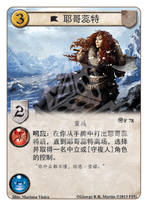 功能说明 响应:在你从手牌中打出耶歌蕊特后,直到耶歌蕊特离场,选择并取得一名中立或[守夜人]角色的控制。