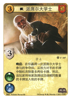 :在你赢得一次派席尔大学士参与的争夺后,从败方对手的手牌中随机弃除最多两张卡牌。然后,该玩家将他家族牌组顶端相同数量的卡牌加入他的手牌。