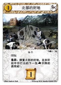 备战:横置北部的封地,在本阶段中你打出的下一张史塔克家族卡牌的费用减1。