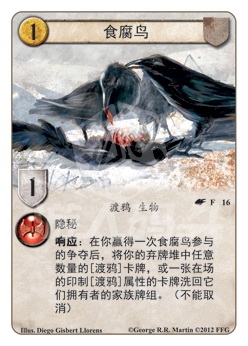 响应:在你赢得一次食腐鸟参与的争夺后,将你的弃牌堆中任意数量的[渡鸦]卡牌,或一张在场的印制[渡鸦]属性的卡牌洗回他们拥有者的家族牌组。(不能取消)