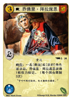 功能说明 响应:一名[贵族]或[贵妇]角色被杀后,乔佛里·拜拉席恩获得1枚权力标记。