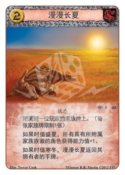如果时值盛夏,所有具有所附属家族族徽的角色获得能力值+1。如果时值寒冬,漫漫长夏返回其拥有者的手牌。