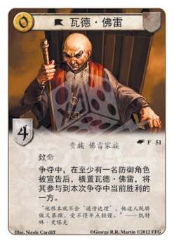 争夺中,在至少有一名防御角色被宣告后,横置瓦德·佛雷将其参与到本次争夺中当前胜利的一方。