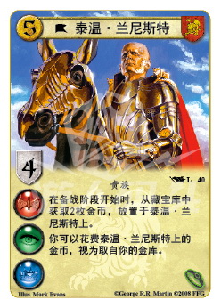 在备战阶段开始时,从藏宝库获得2枚金币,放置于泰温·兰尼斯特上。