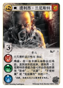 :在一张卡牌从暗影区出场后,直到本阶段结束,提利昂·兰尼斯特获得能力值+2并有你选择拥有“致命”、“名望”、“不受附属”或“免疫事件”中的一个。