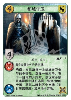 :在你赢得一次都城守卫参与的争夺后,选择一位对手。在下一阶段的开始时,该玩家必须从暗影区中随机选择一张他/她的卡牌,将其从暗影区出场(支付所需费用)或从场中弃除。