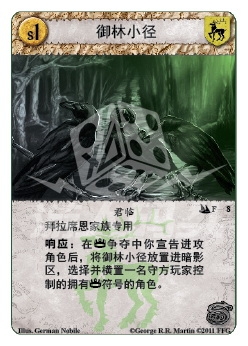争夺中你宣告进攻角色后,将御林小径放置进暗影区,选择并横置一名守方玩家控制的拥有
