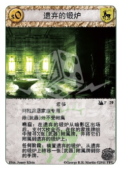 响应:在遗弃的锻炉从暗影区出场后,支付X枚金币,在你的家族牌组中搜寻X张[武器]附属牌,并将它们附属到遗弃的锻炉上。任何阶段:横置遗弃的锻炉,从遗弃的锻炉上转移一张[武器]附属牌到你的手牌。